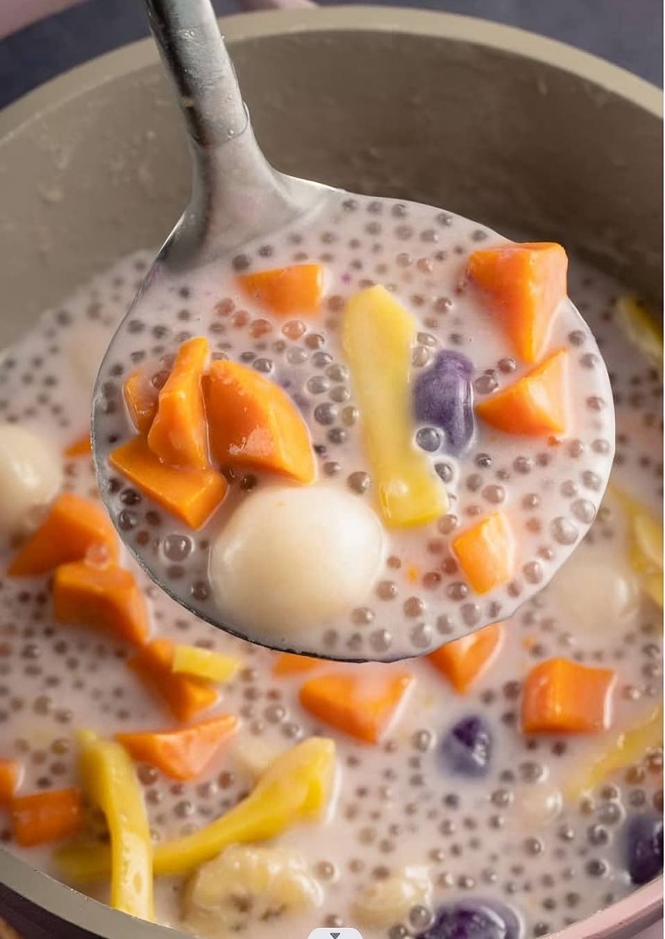 4. Add the dumplings and fruit: Drop the rice dumplings into the simmering coconut milk and cook until they float, about 5 minutes. Add the saba bananas, jackfruit, and sago pearls (if using), and cook for an additional 5-10 minutes.