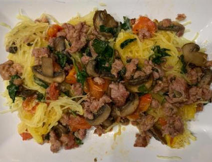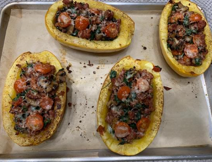 This makes good use of a spaghetti squash. It is stuffed with sausage, spinach and mushrooms which make for a very tasty dish. We grow spaghetti squash in the garden and this is a great way to add amazing flavour to squash.