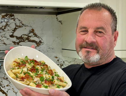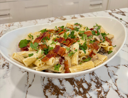 Norbert Bolger’s signature pasta dish was born after attending a benefit with friends, when he and his wife Karen came home and were still hungry. A little rummaging, a lot of improvising, and a pot of pasta later, a classic was born. With cream, cheese, bacon, garlic, and mushrooms—it’s rich, simple, and unforgettable. So good, in fact, Norbert had to write it down the next day.